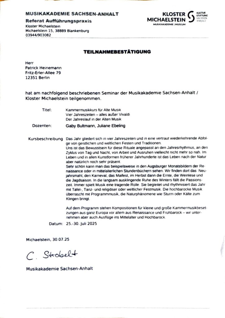 Unter diesem Motto stand der diesjährige Kammermusikkurs, der wieder unter der bewährten Leitung von Gaby Bultmann und Juliane Ebeling stattfand. Bekanntere und unbekannte Komponisten wurden schon in allen Zeiten angeregt, vielfältige Musik über die Jahreszeiten, Tageszeiten und Ereignisse des täglichen Lebens zu schreiben. So spielten und sangen wir wieder vielfältige Musik, klein und groß besetzt. Unter den Eindrücken entstand in den Tagen auch mein neuestes Stück „Die Jahreszeiten – Suite im alten Stil für Instrumente (SATB) ad lib. .