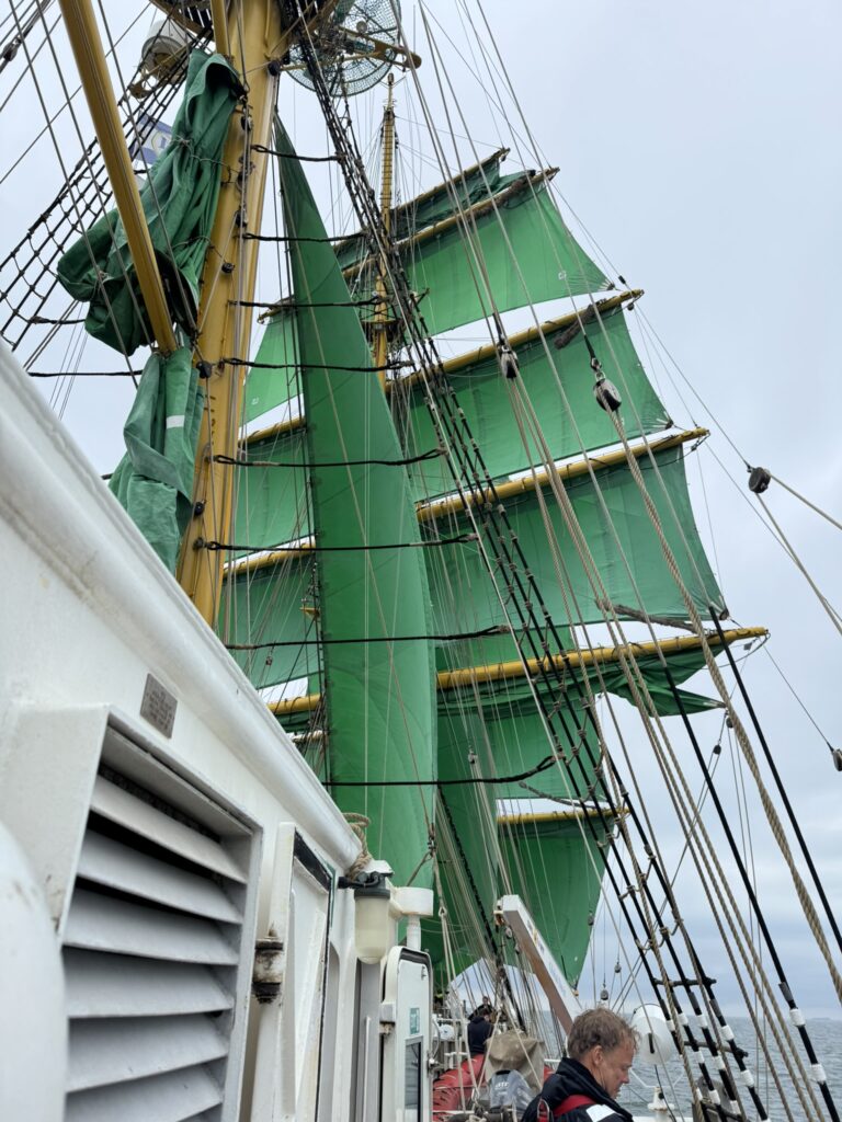Nachdem wir erst durch die schmale Brücke und eine Schleuse mussten, was unserer Kapitänin meisterhaft gelang, waren wir schon in der Weser. Wie an den grünen Segeln zu sehen, war der Wind günstig und wir konnten Richtung Skagerrak segeln.