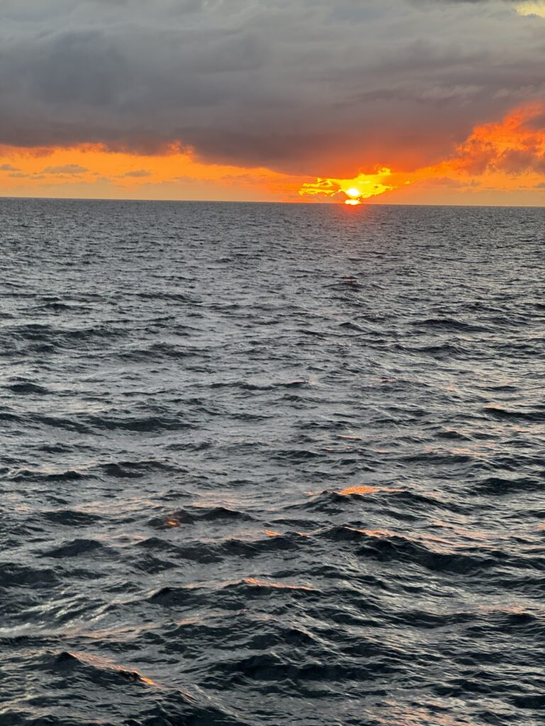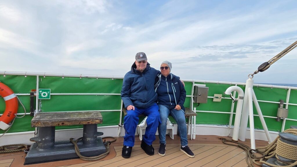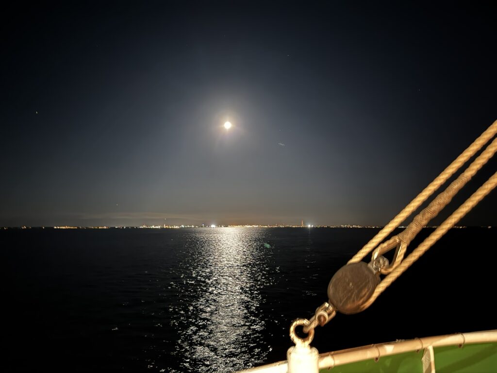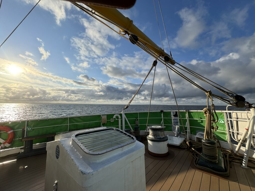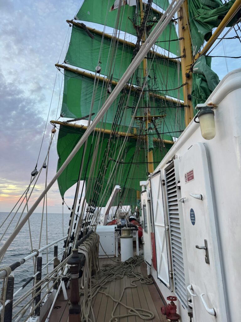 Allmählich ging wieder die Routine, also 24 Stundenwachbetrieb, in Gang. Damit auf See alles reibungslos klappt, ist die Crew für das Segeltraining in 3 Wachen eingeteilt, die sich alle 4 Stunden abwechseln. Für mich war es schon mein zweiter Törn als 2. Wirtschafter in der Stammcrew. In meiner Funktion bin ich für die Hygiene an Bord verantwortlich, z.B. Einweisung der Backschaften (Küchendienst), Wäscherei, usw. . Ich konnte mir die Arbeit mit der 1. Wirtschafterin Jutta, die sehr erfahren ist, gut aufteilen. Da alle gut mitmachten, war der Dienst sehr entspannt, also konnten wir uns auch erholen, denn es war für uns ja quasi „Aktivurlaub“.