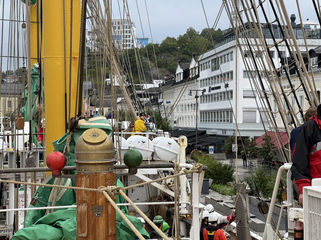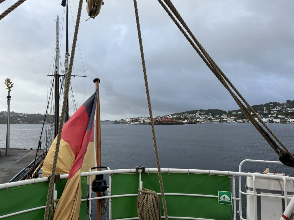Wie auf den Fotos zu sehen, erforderte schon die Einfahrt vor dem Hafen, aber auch das Anlegen die äußerste Konzentration von allen, insbesondere der Kapitänin. Aber es klappte alles perfekt und wir konnten das Unwetter in Arendal abwarten und abends auch die kulinarischen Angebote der schönen Hafenstadt genießen.