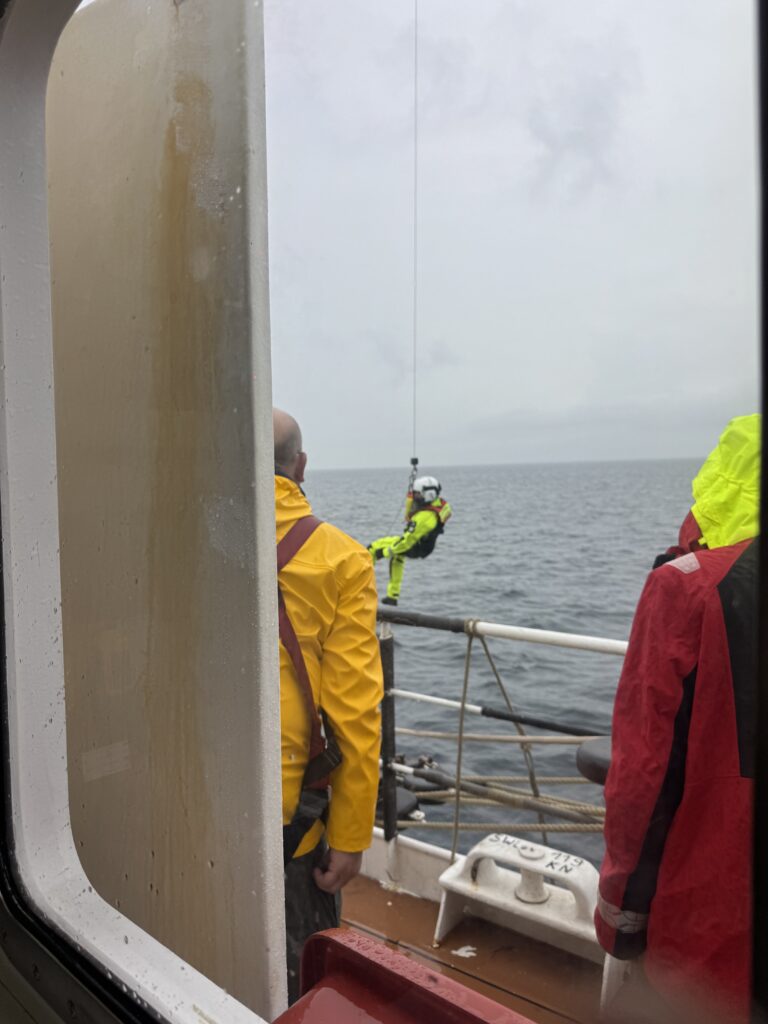 Nach dem wir den Skagerrak durchquerten, waren wir inzwischen im Kattegat (Karte), mitten in der Ostsee, angekommen. Dort funkte uns die schwedische Küstenwache an, um eine Übung mit dem Abseilen einer Rettungskraft aus dem Hubschrauber an Bord der Alexander von Humboldt II durchzuführen. Es klappte perfekt, der Hubschrauberpilot und die Alex II konnten ihre Position so halten, das der „Besuch auf hoher See“ erfolgreich verlief, für alle eine willkommene, spannende Übung. Denn so ein Manöver kann ja mal notwendig sein.