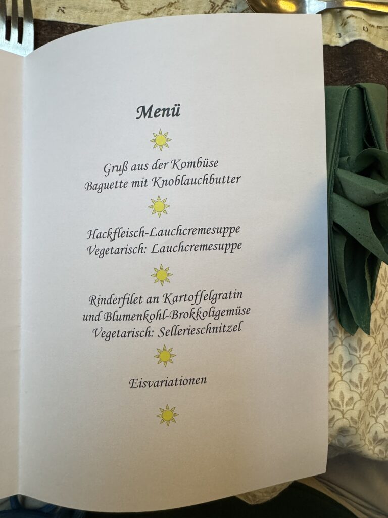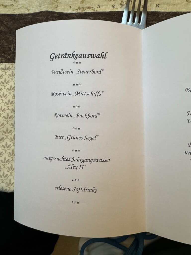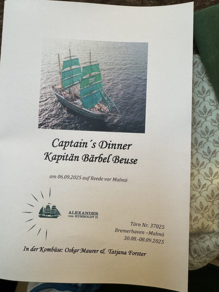 Vor Anker vor Malmö (Karte) fand am vorletzten Abend das vorzügliche Captains Dinner statt, an dem sich die Kombüsencrew (Oskar und Tatjana) noch mal selbst übertraf.